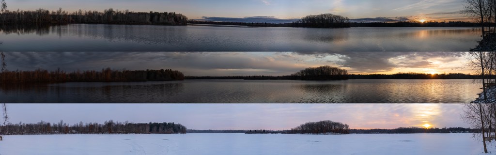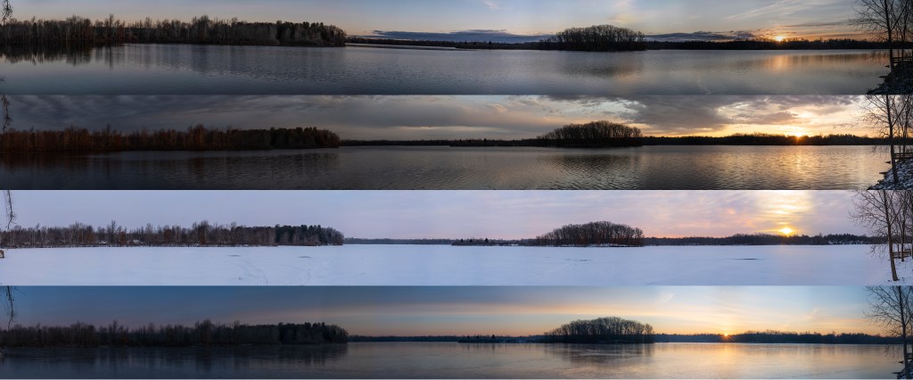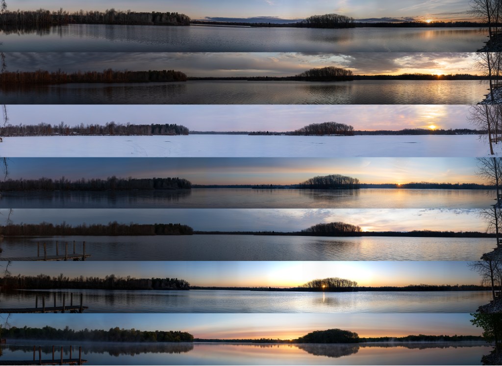 With only 4 visits left to this quiet lake I can see I will need to do a bit of cropping to each image, so the sun’s path is centered on the canvas, but I am very pleased with the resulrs.