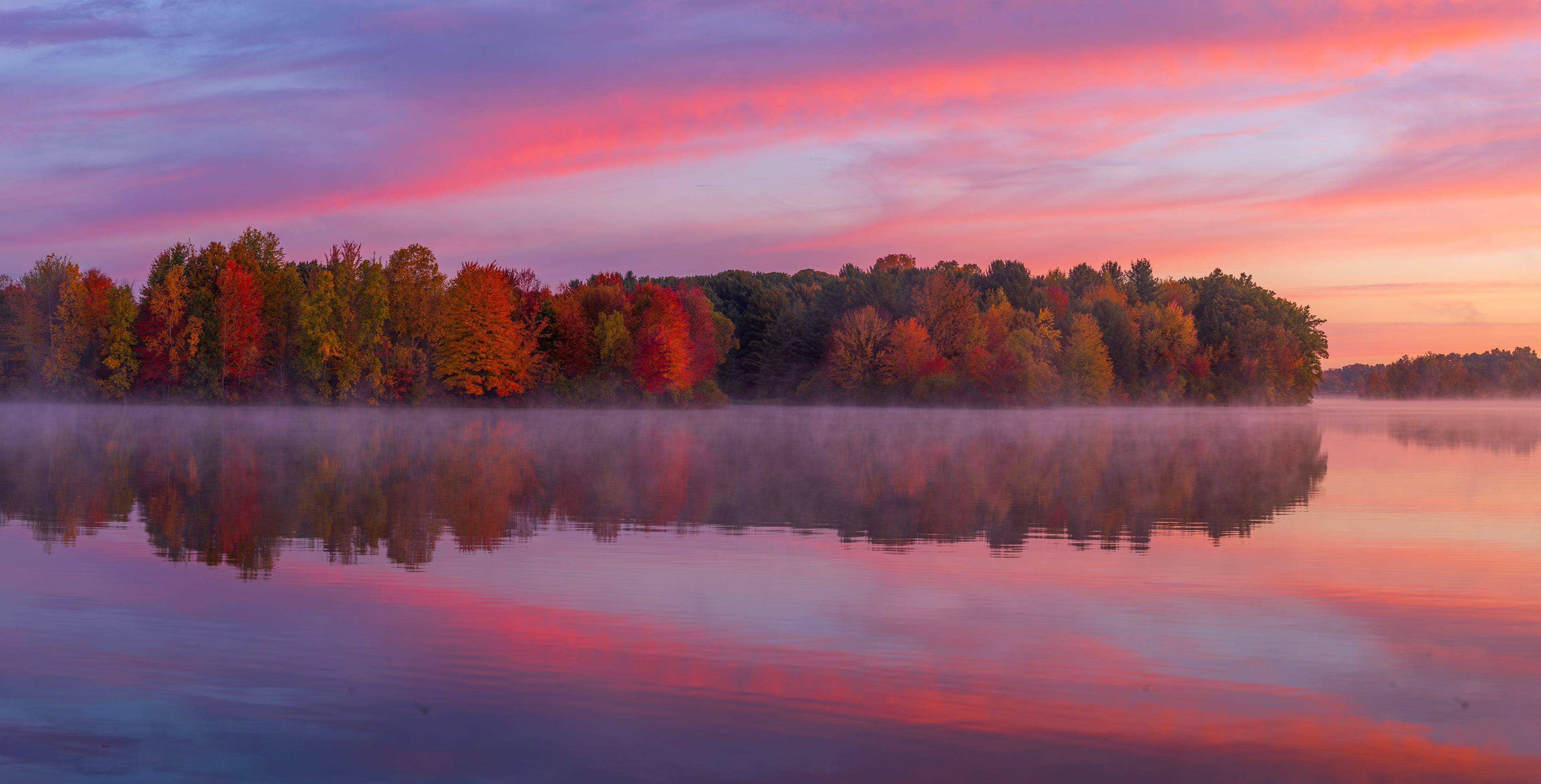 The horizon was painted with streaks of pink, orange, and purple, blending seamlessly into one another as if an artist had taken a brush and delicately swept across the canvas of the sky against the bright autumn colors on the shore. The calm waters of Lake Ovid mirrored this kaleidoscope of colors, creating a stunning symphony of hues that danced gently on the surface. The reflection was so vivid that it seemed as though the lake itself had been infused with the morning’s first light. The air was crisp, filled with the promise of a new day. Every second brought a shift in the palette, as the sun slowly ascended, casting its golden glow and illuminating the scenic beauty that surrounded us. It was a visual feast, a rare moment of awe that held us captive in its serene embrace.